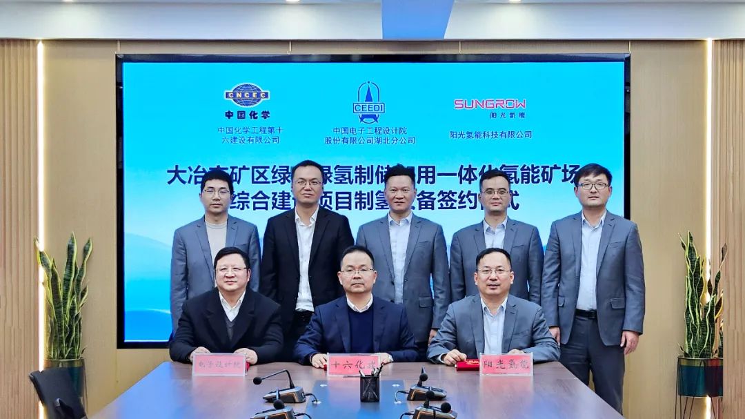 12月26日,國家清潔低碳氫能創新應用工程——大冶市礦區綠電綠氫制儲加用一體化氫能礦場綜合建設項目“制氫設備”合同正式簽約。中國化學工程第十六建設有限公司武漢分公司總經理李靜濤,中國電子工程設計院股份有限公司湖北分公司執行院長王共,陽光電源副總裁、陽光氫能董事長彭超才等領導出席。