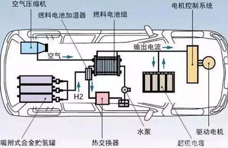 事情還要回到本質上看,使用燃料電池的過程是這樣的,氫和氧在電池中通過化學反應產生電流,再將電流輸入到鋰電池組中,最終靠鋰電池提供動力。