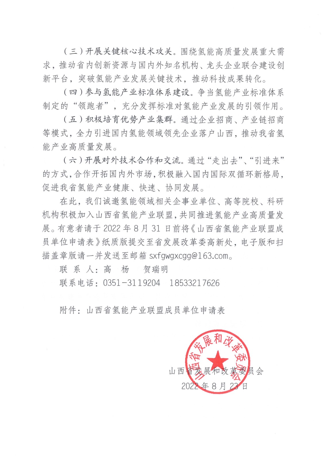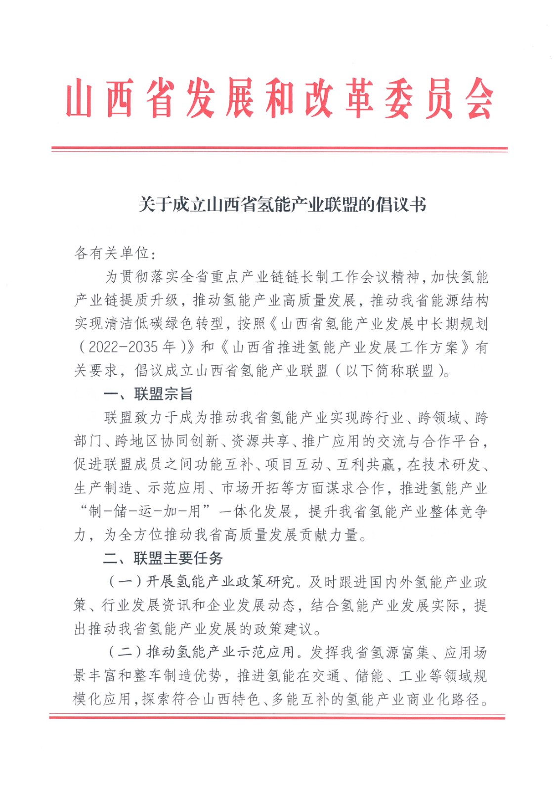 氫啟未來網8月24日消息,山西省發展和改革委員會在其網站印發關于成立山西省氫能產業聯盟的倡議書。其中提出,推動氫能產業示范應用。發揮山西省氫源富集、應用場景豐富和整車制造優勢,推進氫能在交通、儲能、工業等領域規模化應用,探索符合山西特色、多能互補的氫能產業商業化路徑。原文內容如下: