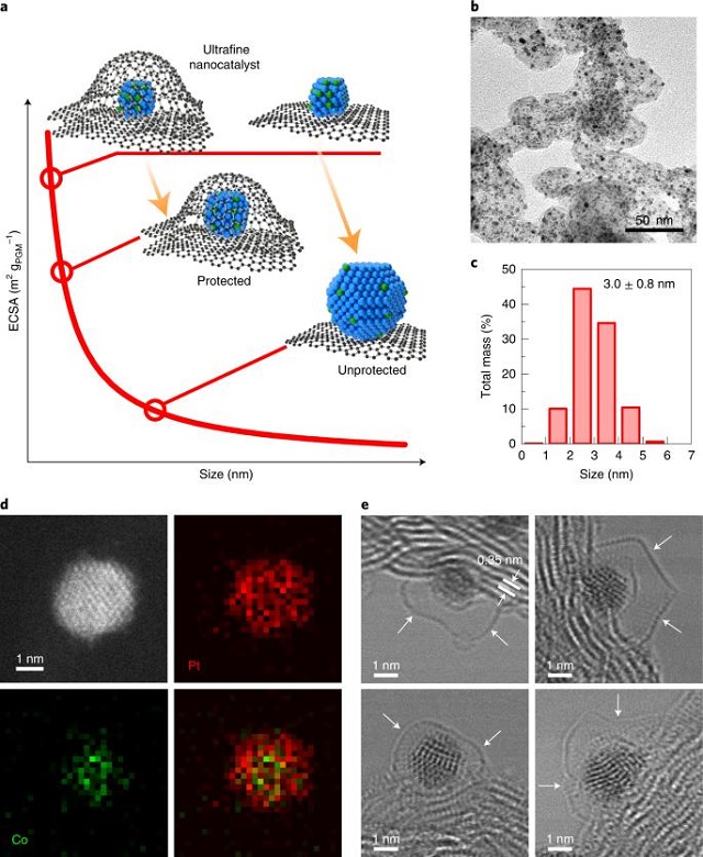 該成果報道了一種由石墨烯納米袋保護的PtCo納米催化劑并應用于質子交換膜燃料電池作為陰極催化劑,由此實現在極具挑戰性的超低鉑載量條件下燃料電池功率密度及耐久性同時達到國際先進水平,預期應用此報道催化劑可將燃料電池汽車所需鉑族金屬(PGM)量降至與內燃機汽車尾氣處理所需相當的水平,這意味著大幅降低燃料電池所需鉑族金屬量,在規模化生產時顯著降低成本,并使其大規模應用不再受限于鉑族金屬極有限的儲量與產量,為進一步推進燃料電池大規模應用鋪墊了道路。本文所報道的工作將是質子交換膜燃料電池大規模推廣的關鍵一步,為該領域重要突破。