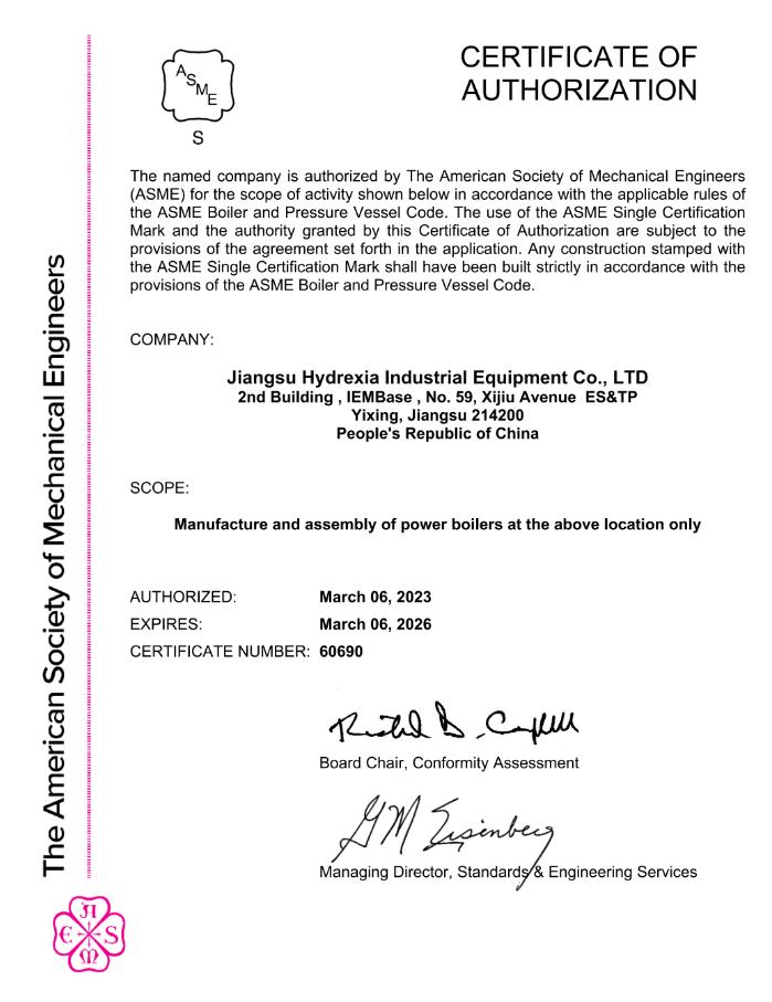 2023年3月,氫楓集團的宜興生產基地順利通過了ASME取證聯檢工作,并取得了“S+U+U2”ASME鋼印證書。此次通過ASME資質認證,標志著集團動力鍋爐及壓力容器裝備質量保證體系得到了國際權威機構的認可,集團裝備生產能力擴大,質量管理水平和技術水平進一步提升。