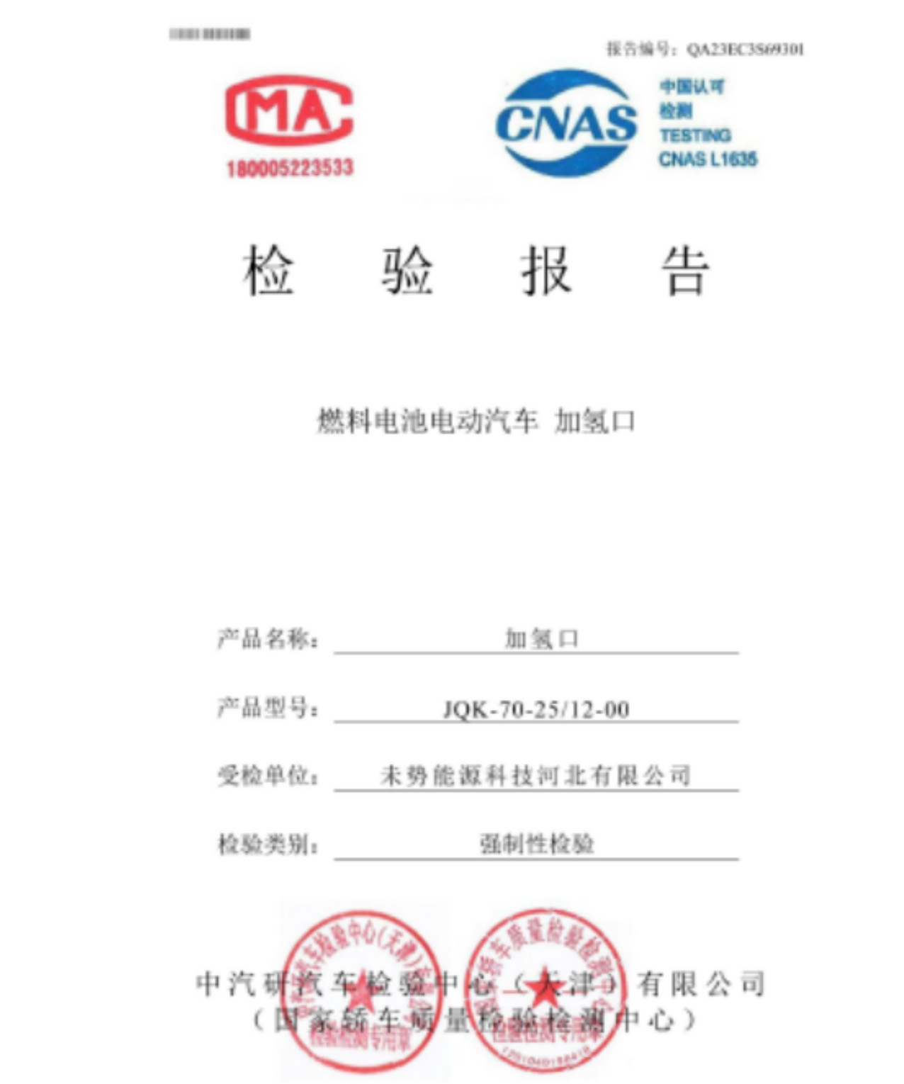 本次順利通過國家強(qiáng)檢認(rèn)證,標(biāo)志著未勢(shì)能源加氫口產(chǎn)品已完全滿足市場準(zhǔn)入條件,具備了生產(chǎn)銷售資質(zhì),同時(shí)也標(biāo)志著未勢(shì)能源加氫口在產(chǎn)品質(zhì)量和安全性能方面,已處于業(yè)內(nèi)領(lǐng)先水平。