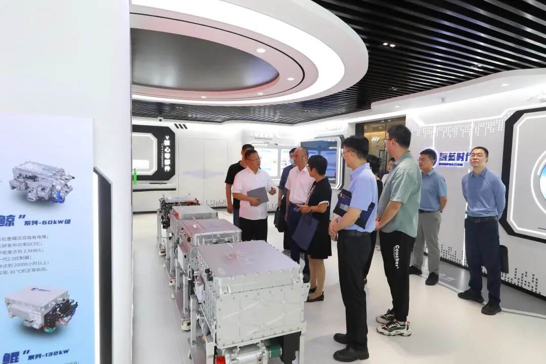 調(diào)研組一行首先參觀了氫藍(lán)科技展廳,詳細(xì)了解了公司“鯨”系列60kW、“鵬”系列80kW、“鯤”系列130+kW、“麒麟”系列200+kW等主力氫燃料電池系統(tǒng)產(chǎn)品,以及自主電堆和相關(guān)關(guān)鍵零部件等展品。