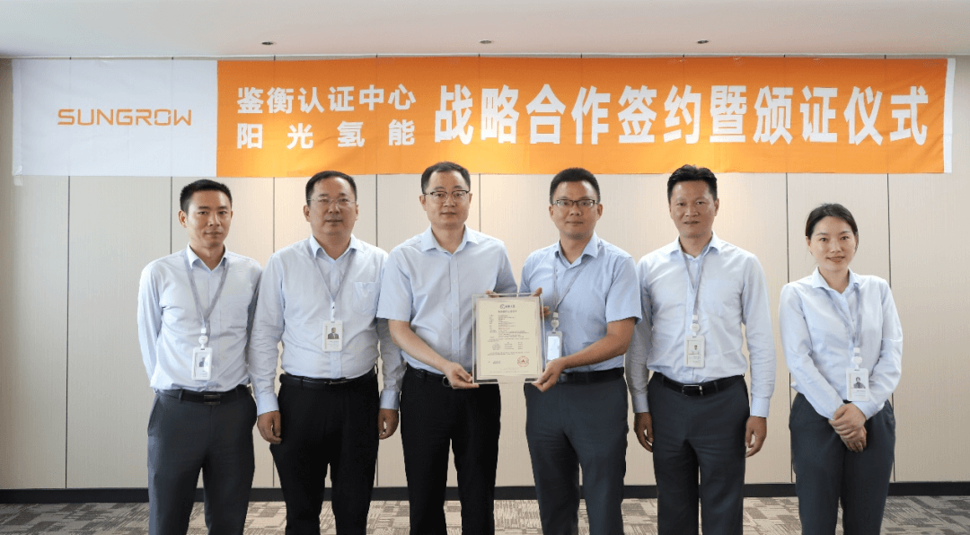 氫啟未來網(wǎng)獲悉,鑒衡認(rèn)證與陽光氫能于6月9日在合肥達(dá)成戰(zhàn)略合作,舉行簽約儀式并頒發(fā)了兩項(xiàng)認(rèn)證證書。出席活動(dòng)的有鑒衡認(rèn)證工業(yè)基礎(chǔ)技術(shù)及部件事業(yè)部總經(jīng)理李浩然,陽光電源副總裁兼陽光氫能董事長彭超才,以及陽光氫能的營銷總經(jīng)理方偉和研發(fā)總經(jīng)理孫龍林等領(lǐng)導(dǎo)。