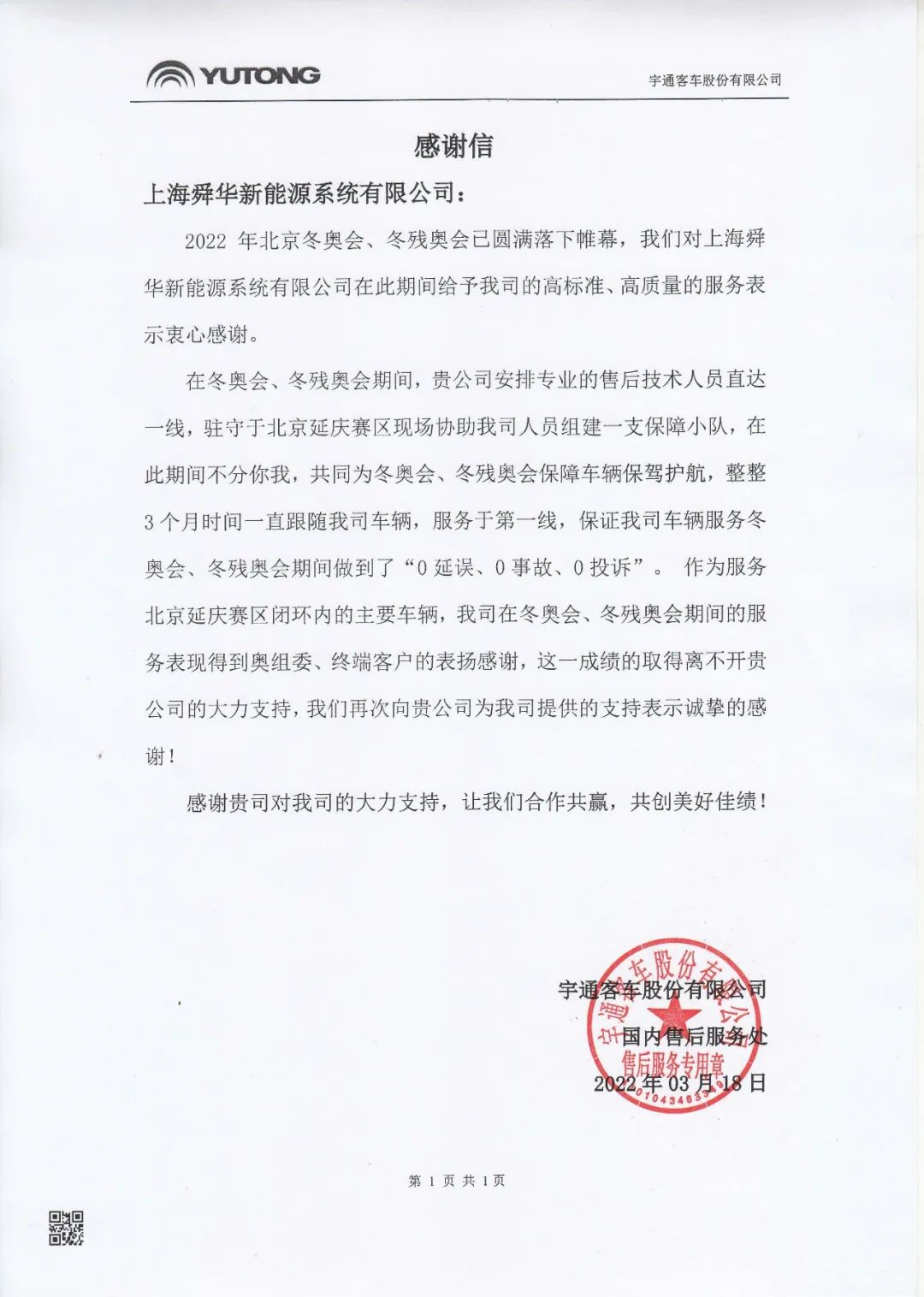 冬奧會后我們陸續收到來自多家客戶的感謝信,上海舜華新能源系統有限公司保供專班服務人員技術專業、快速響應、高效服務,圓滿地完成了賽事保障工作,贏得了客戶的認可。
