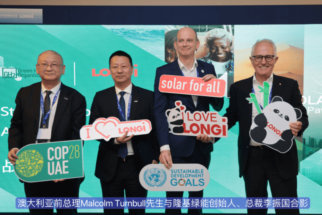 12月5日,共推全球氣候問題的最高峰會(COP28)于迪拜召開,隆基綠能與GH2國際綠氫組織在光伏+隆基展臺簽署戰略合作框架協議。澳大利亞前總理Malcolm Turnbull先生、GH2 CEO Jonas Moberg先生、中國產業發展促進會氫能分會副會長兼秘書長張宇女士以及隆基綠能創始人、總裁李振國、隆基氫能總裁馬軍、隆基綠能品牌總經理霍焱等出席此次活動。