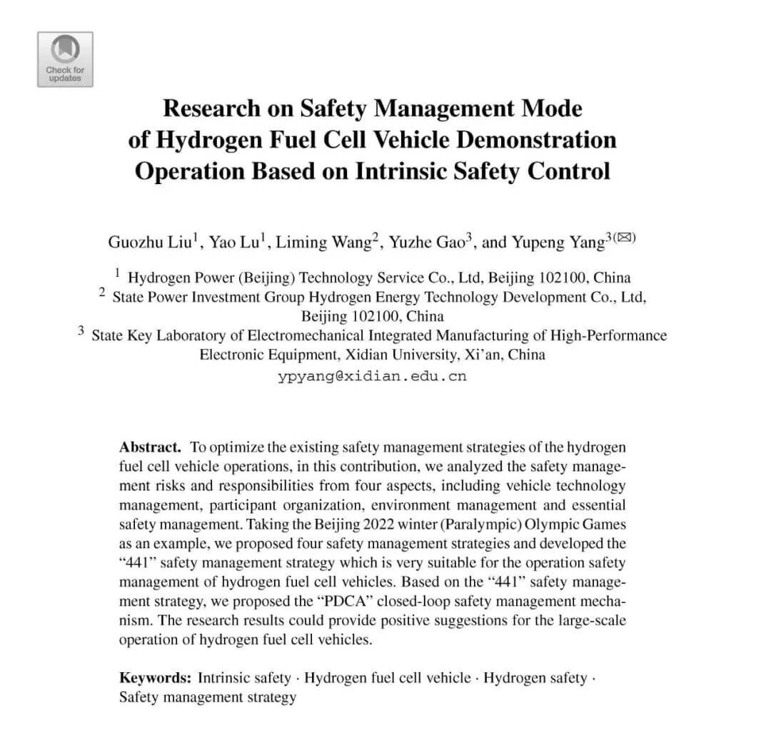 近日,氫動力科技EI論文發(fā)表,該論文是氫動力科技聯(lián)合國家電投集團氫能科技發(fā)展有限公司、西安電子科技大學高性能電子裝備機電集成制造全國重點實驗室內(nèi)部立項的科研課題《Research on safety management mode of hydrogen fuel cell vehicle demonstration operation based on intrinsic safety control》的成果轉(zhuǎn)化,日前在Springer Proceedings in Physics(ISSN 1867-4941, EI-Compendex源)出版(EI),EI論文的發(fā)表標志著公司氫能零碳交通科技平臺運營安全管理研究邁上新臺階。