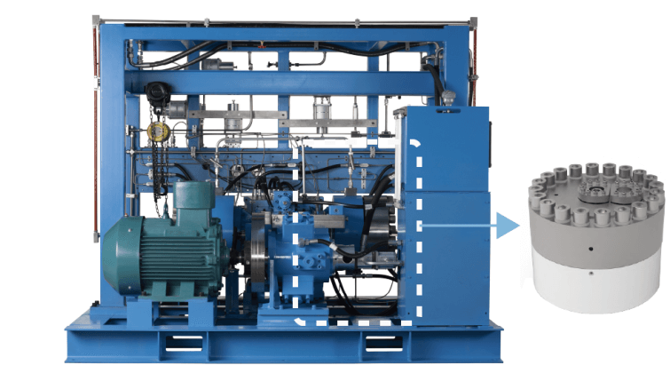 液驅隔膜式氫氣壓縮機通過液壓泵直驅+高頻換向閥代替傳統的曲柄連桿+活塞、皮帶傳動,在壓縮過程中有效保證氣體絕對潔凈,單級壓縮即可實現大于10的壓縮比。產品研制過程中,完成整機5000h壽命試驗,在沒有更換損耗件的前提下實現了無故障運行遠遠超過國內外能源行業對設備的試驗要求,膜片、閥門經過10000h壽命測試考驗。